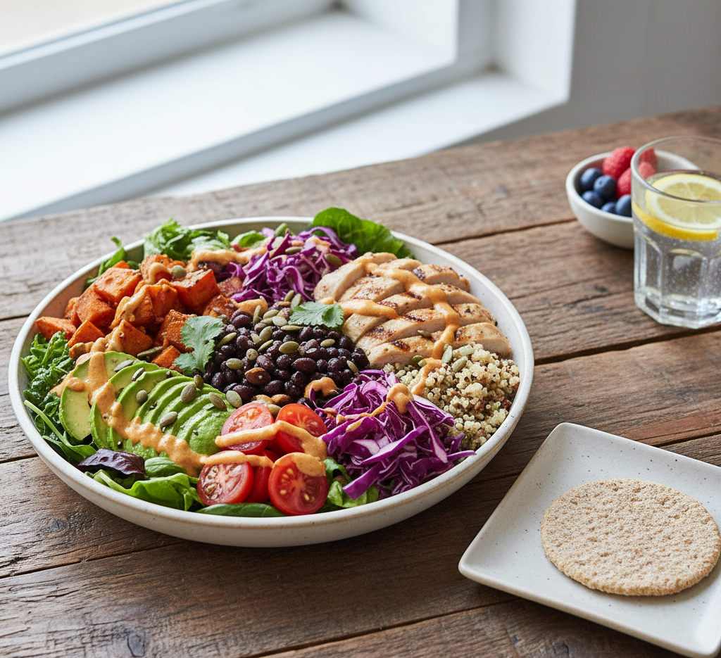 | B2: “Savory” Scramble | L2: “Mason Jar” Salad | D2: “Smart” Burger Bowl (lean patty, sweet potato, salad) | S2: Greek Yogurt Cup (plain, 170g) | S9: Greek Yogurt Cup (plain, 170g) |