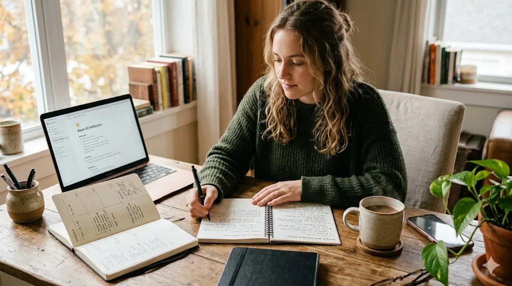 Every Sunday, I spend 15 minutes on a three-question review: What worked this week? What didn’t? What one thing do I want to do differently? I use a simple Notion template (free), though a paper notebook works identically.