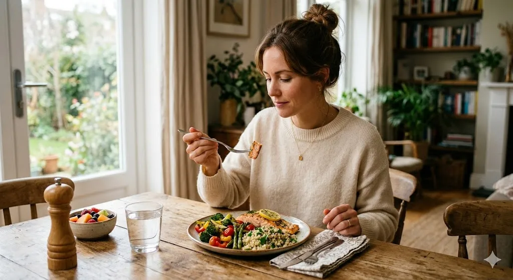 Not a diet. Not calorie counting. Not macros. One intentional meal — meaning you chose it consciously, you ate it slowly, and you paid attention to how it made you feel afterward.