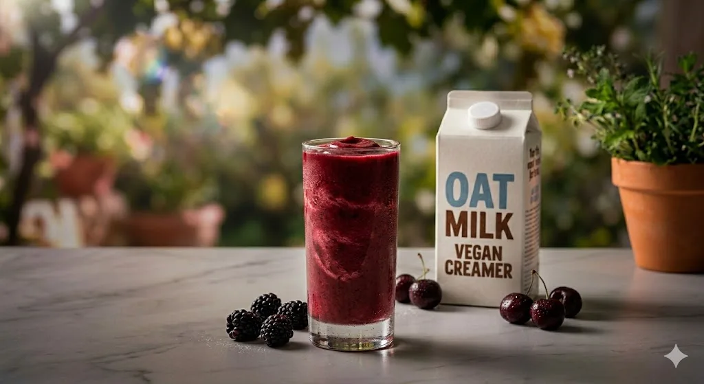 1 cup frozen raspberries, 1 frozen banana, 1 cup oat milk. Blend smooth. The raspberries bring tartness and color. The banana sweetens and thickens. The oat milk adds a subtle creaminess that dairy-free smoothies often lack. Oat milk (Oatly Barista or Califia Farms are reliable) works particularly well here because its slight natural sweetness complements rather than competes with the fruit.