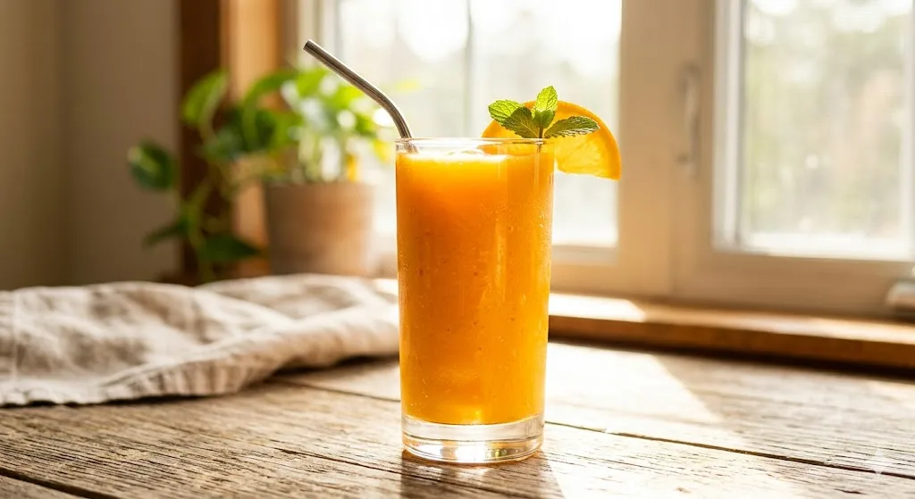 1.5 cups frozen mango, 1 cup cold-pressed carrot juice, 1 teaspoon fresh ginger. Blend smooth. Carrot juice is surprisingly sweet and provides beta-carotene in quantities that make this smoothie a meaningful nutritional contribution rather than just a cold drink. Cold-pressed carrot juice from the refrigerated section (brands like Suja or Evolution Fresh, around $5 to $8 per bottle) tastes dramatically better than shelf-stable carrot juice, which tends to have a cooked, slightly metallic undertone.