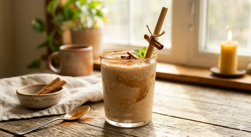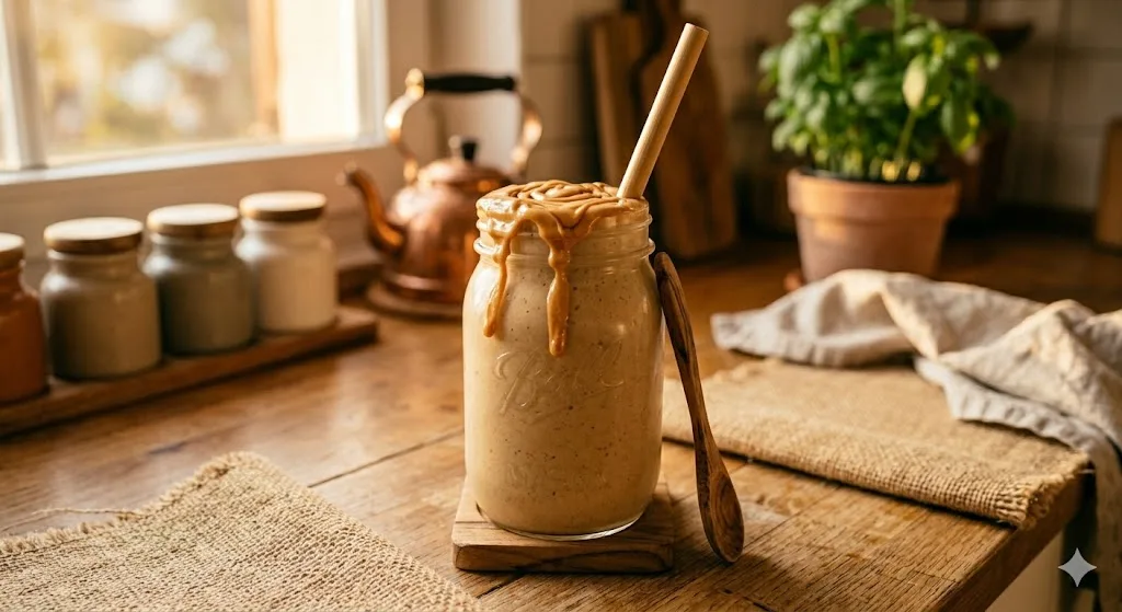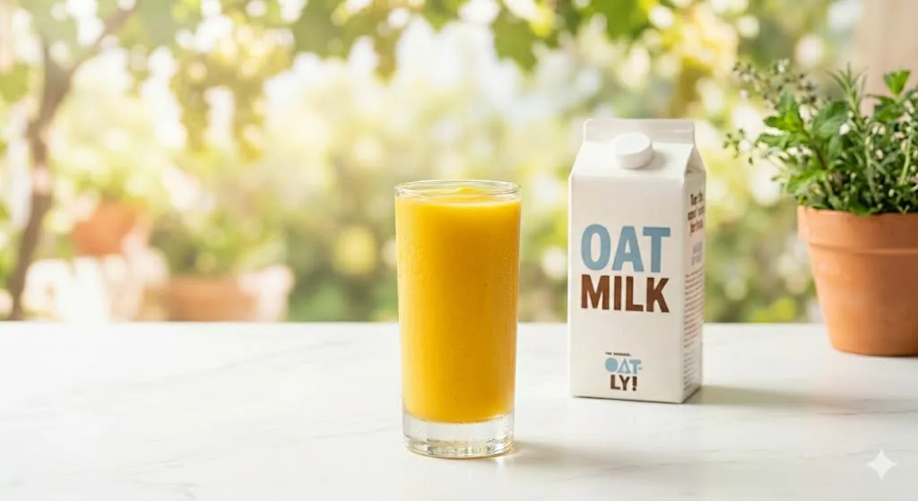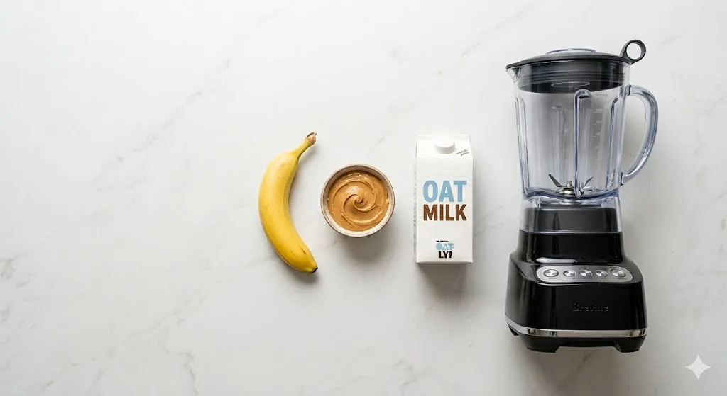 One frozen banana, 2 tablespoons natural peanut butter, 1 cup oat milk. Blend until smooth. The frozen banana provides sweetness without any added sugar and creates a texture so thick it’s almost milkshake-adjacent. The peanut butter adds protein and fat. The oat milk brings it to drinkable consistency.