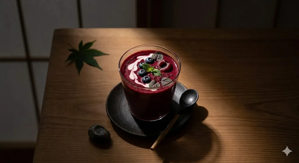 1.5 cups frozen mixed berries, 1/2 cup cold beet juice, 1/2 cup Greek yogurt. Blend until smooth. Beet juice is rich in dietary nitrates, which the body converts to nitric oxide — a compound that dilates blood vessels and can measurably improve exercise performance and lower blood pressure. A 2012 study in the Journal of the Academy of Nutrition and Dietetics found significant performance improvements in cyclists who consumed dietary nitrates before exercise. The berries and yogurt prevent the earthiness of beet from dominating. The color is a deep, vivid burgundy.