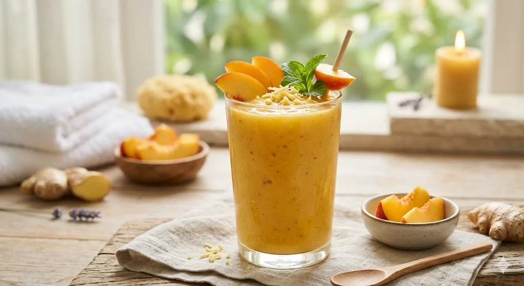 1.5 cups frozen peach slices, 1 teaspoon fresh ginger (grated), 1 cup fresh orange juice. Blend until silky. The ginger adds warmth and anti-inflammatory compounds — specifically gingerols — that make this smoothie feel functional as well as refreshing. Don’t use ground ginger here. Fresh ginger has a brightness and bite that the dried version completely lacks.