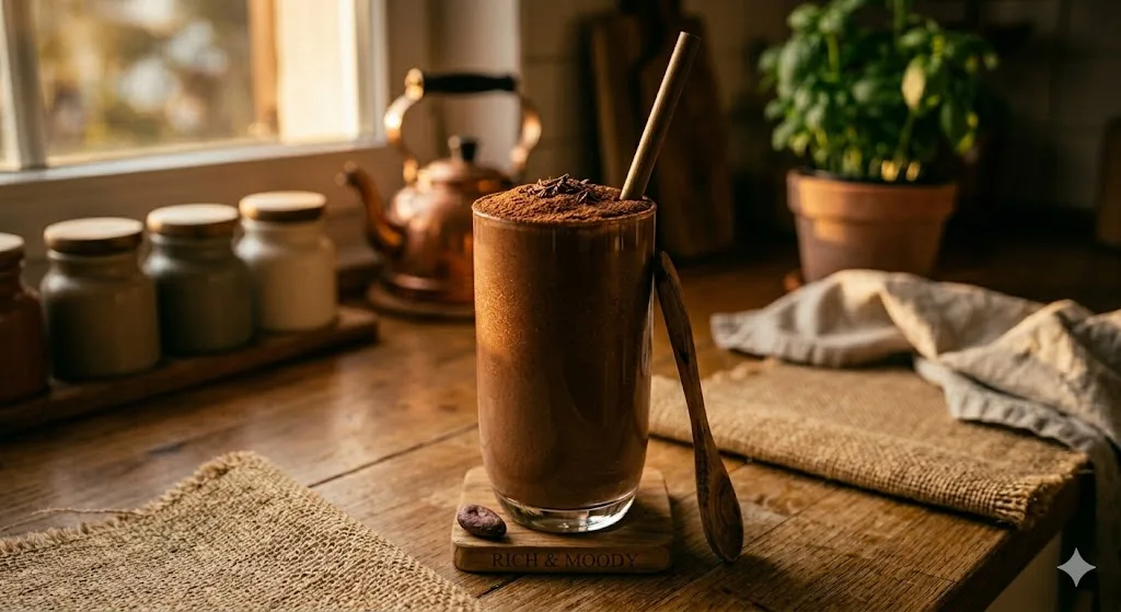 1 frozen banana, 2 tablespoons unsweetened cocoa powder, 1 cup unsweetened almond milk. Blend smooth. The frozen banana provides all the sweetness this needs. Raw cocoa powder (like Navitas Organics Cacao Powder, around $12 for 16 oz) has a more complex, slightly bitter flavor than Dutch-process cocoa and higher antioxidant content. Either works. The banana carries both.