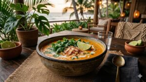 Method: Bloom curry paste in oil 2 minutes. Add onion, garlic, and ginger. Add lentils, squash, broth, and coconut milk. Simmer 20 minutes. Blend partially for texture. Finish with lime, cilantro, and toasted coconut flakes.