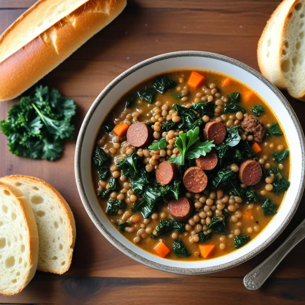 Use Italian sausage (casings removed) browned with the aromatics. Add brown or green lentils, chicken broth, one can of diced tomatoes, and a parmesan rind (game-changer for depth). Stir in torn lacinato kale in the last five minutes. Finish with a drizzle of high-quality olive oil and fresh grated parmesan.