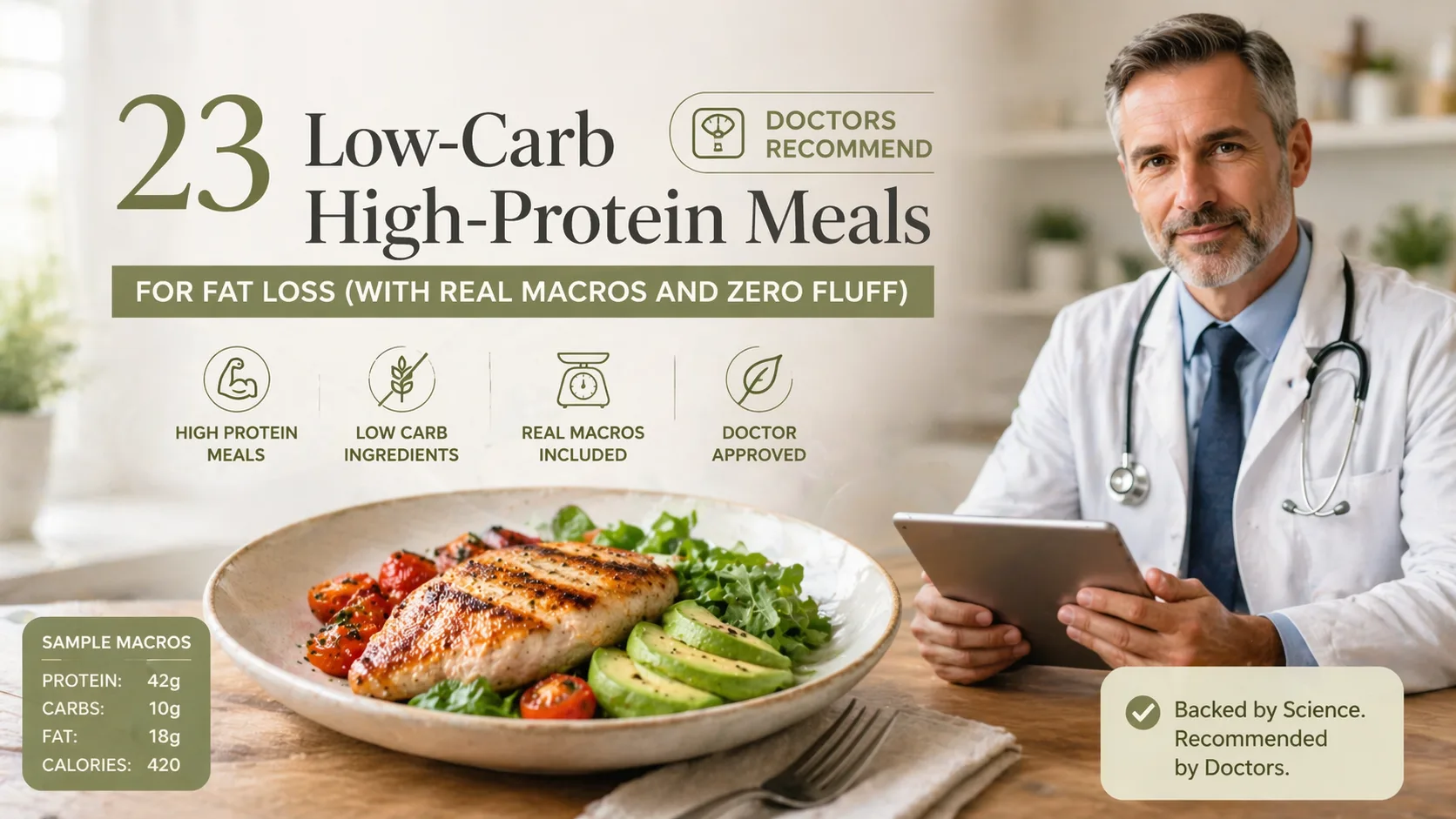 This guide fixes that. You will find 23 specific meals that doctors and registered dietitians recommend for fat loss, with protein and net carb counts for every single one. You will also find the science that makes this work, the mistakes that derail most people, and one contrarian truth that almost nobody in the nutrition space will say out loud.