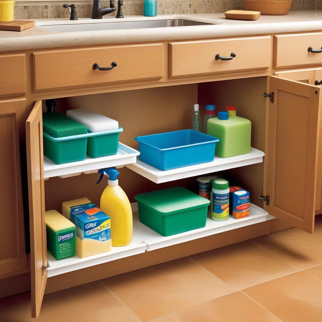 The mDesign adjustable under-sink organizer system (~$30) works around plumbing with a configurable design. It adds two shelves that sit beside not over pipes, and adjustable legs accommodate uneven cabinet floors. Before this, I had three years of loosely stacked cleaning bottles under my sink.