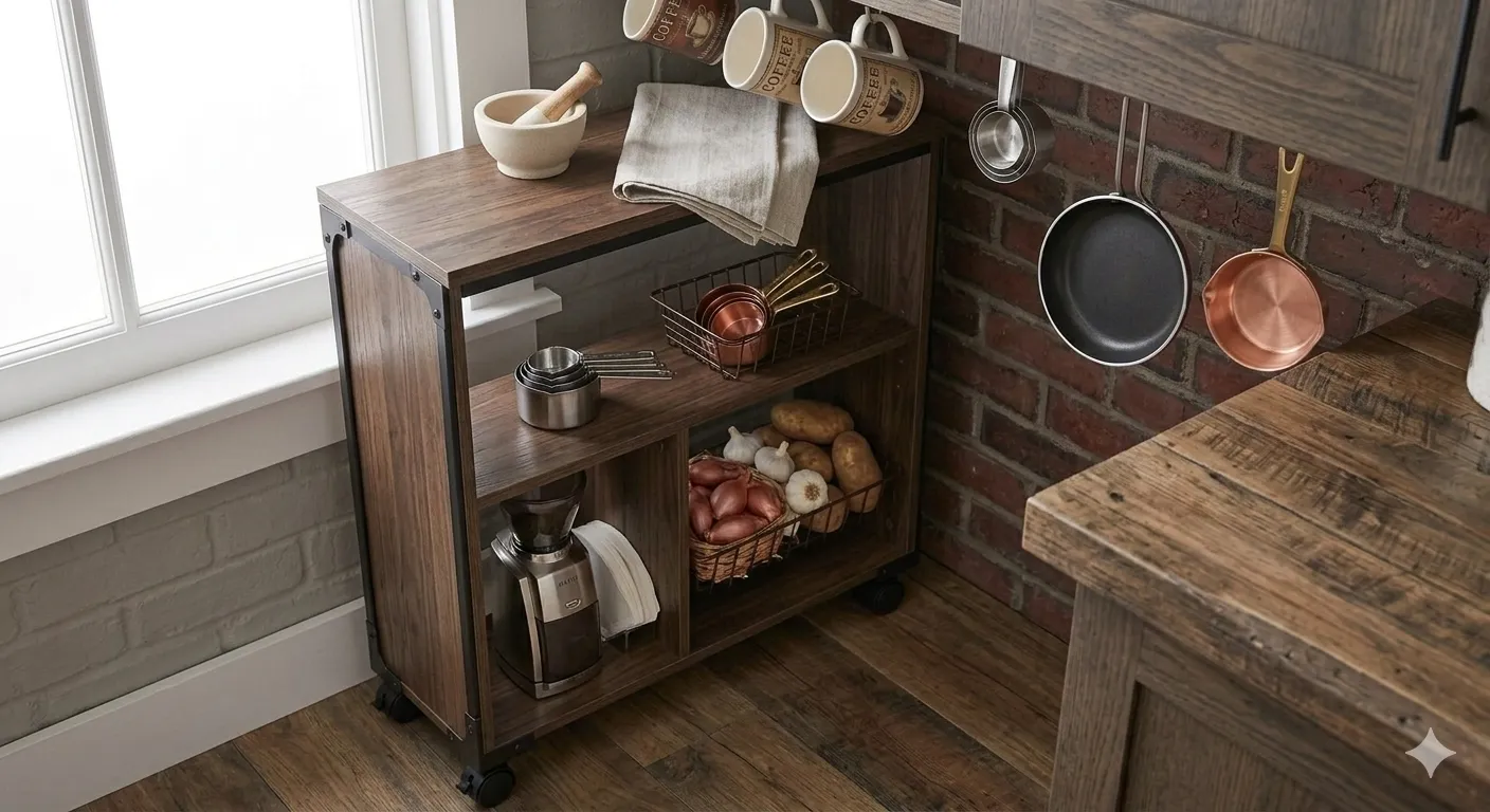 A rolling kitchen cart does triple duty: adds counter space, adds storage underneath, and moves when you need floor room. The IKEA RÅSKOG ($25) is shallow and great for small spaces. The Seville Classics UltraHD ($120) is sturdier and better for food prep.