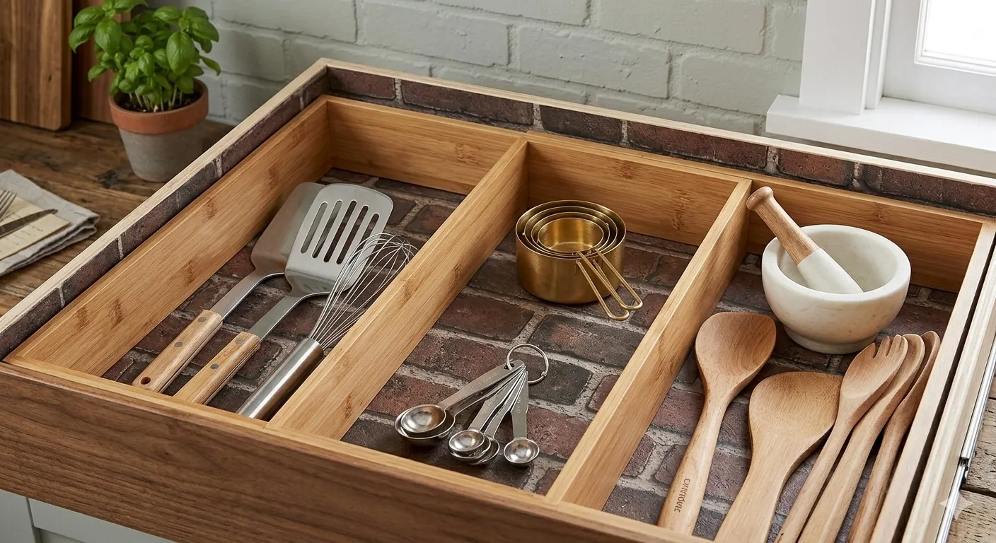 The issue in most small kitchens is that drawer organizers are designed for wide, spacious drawers. If your drawers are narrow (mine were 11 inches wide practically a slot), most commercial organizers simply do not fit. This is where bamboo expandable dividers from Bambüsi work well. They telescope to fit any drawer width and are less likely to slide around than plastic versions. Cost is about $22 for a set.