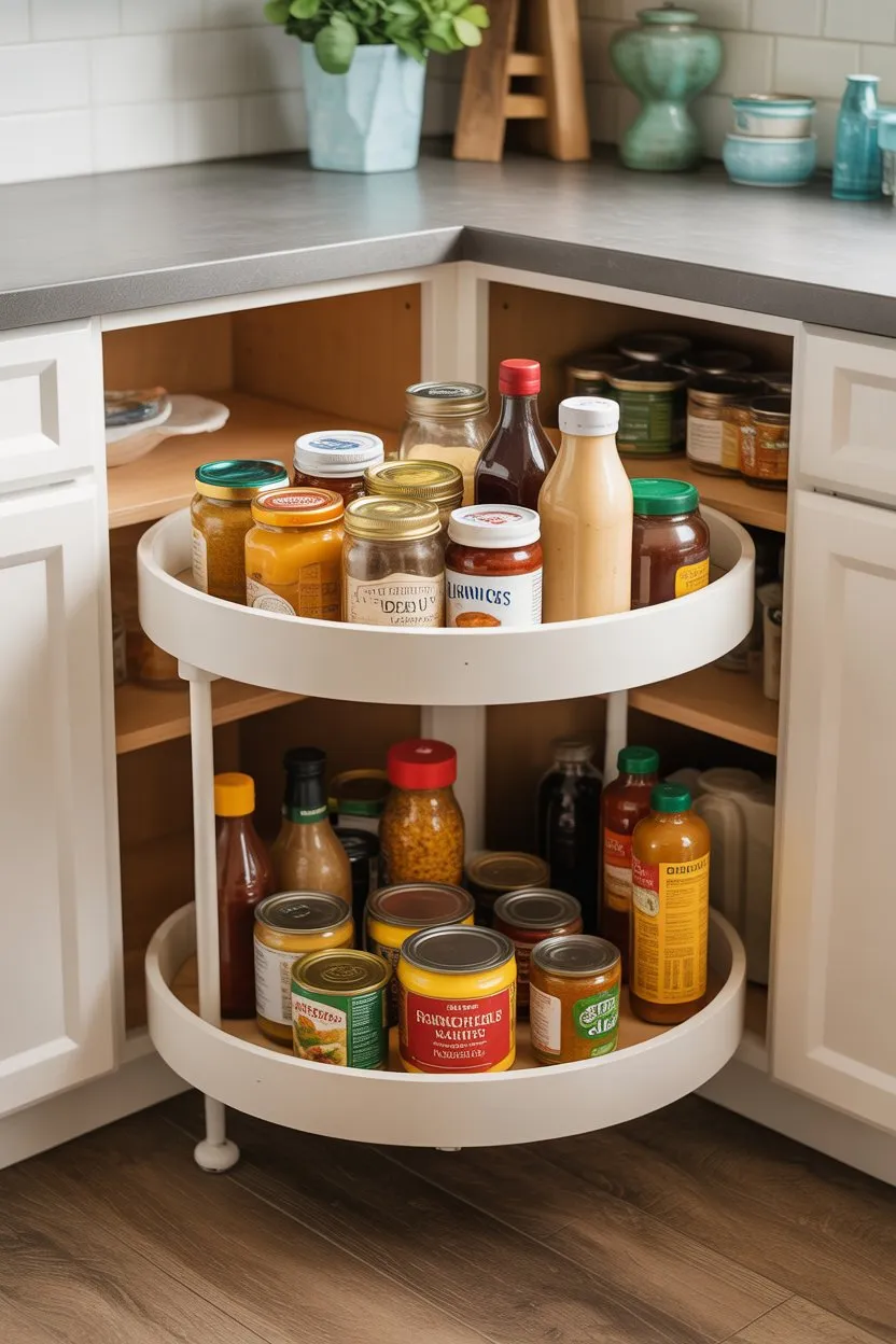 Corner cabinets are accessibility nightmares — the stuff at the back is essentially lost. A two-tier lazy Susan ($18 to $30 from Copco or IKEA) turns that dead corner into genuinely accessible storage. My pantry cabinet had three years of forgotten canned goods in its back corner before I made this change.