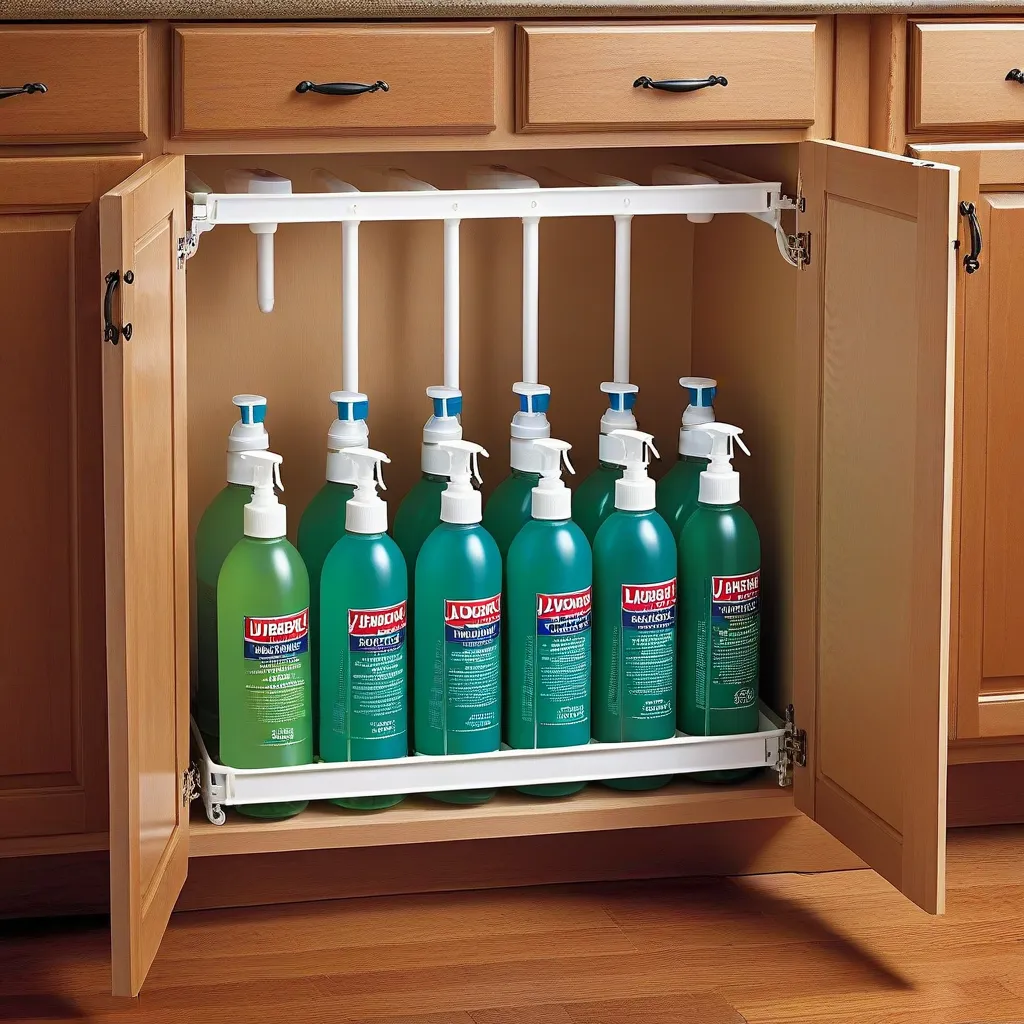 A single tension rod stretched horizontally in your under-sink cabinet holds spray bottles by their triggers, keeping them upright and off the floor entirely. This costs about $4, takes two minutes, and people cannot believe they didn’t think of it earlier. My most-shared tip, by far.