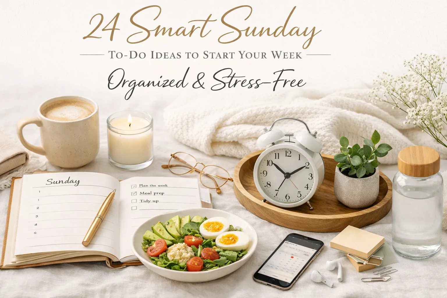This is where most Sunday productivity advice starts — and most people stop. Grocery lists. Laundry. Meal prep. These matter, but they’re not the whole picture. The ideas below mix the logistical with the intentional.